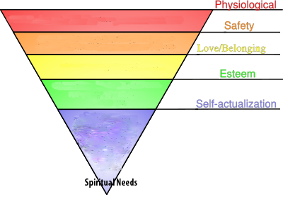 Imagine a flow of action extending up and out from the triangle’s apex. Our most obvious motivations are farther from the source, but closer to the surface and more visible – the physiological needs. Our spiritual path is to work our way down the triangle by backing away from lesser wants. Spiritual practices often include a period of denying wants through fasting, celibacy, solitude, and other “ascetic” practices. Satisfying all of our lesser needs does not move us towards a spiritual realization. We don’t work our way through the pyramid by satiation. This inverted pyramid also illustrates why Maslow noted transcendent experiences occurring throughout his hierarchy – the spiritual need is the source of human existence rather than the culmination.