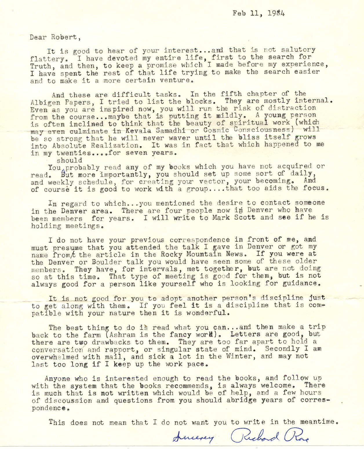 Feb 11, 1984 Dear Robert, It is good to hear of your interest and that is not salutory flattery. I have devoted my entire life, first to the search for Truth, and then, to keep a promise which I made before my experience, I have spent the rest of that life trying to make the search easier and make it a more certain venture. And these are difficult tasks. In the fifth chapter of the Albigen Papers, I tried to list the blocks. They are mostly internal. Even as you are inspired now, you will run the risk of distraction from the course maybe that is putting it mildly. A young person is often inclined to think that the beauty of spiritual work (which may even culminate in Kevala Samadhi or Cosmic Consciousness) will be so strong that he will never waver until the bliss itself grows into Absolute Realization. It was in fact that which happened to me in my twenties .for seven years. You should probably read any of my books which you have not acquited or read. But, more importantly, you should set up some sort of daily and weekly schedule, for creating your vector, your becoming. And of course it is good to work with a group .that too aids the focus. In regards to which you mentioned the desire to contact someone in the Denver area. There are four people now in Denver who have been members of years. I will write to Mark Scott and see if he is holding meetings. I do not have your previous correspondence in front of me, and must presume that you attended the talk I gave in Denver or got my name from the article in the Rocky Mountain News. If you were at the Denver or Boulder talk you would have seen some of these older members. They have, for intervals, met together, but are not doing so at this time. That type of meeting is good for them, but is not always good for a person like yourself who is looking for guidance. It is not good for you to adopt another person's discipline just to get along with them. If you feel it is a discipline that is compatible with your nature then it is wonderful. The best thing to do is read what you can and then make a trip back to the farm (Ashram is the fancy word). Letters are good, but there are drawbacks to them. They are too far apart to hold a conversation and rapport, or singular state of mind. Secondly I am overwhelmed with mail, and sick a lot in the Winter, and may not last too long if I keep up the work pace. Anyone who is interested enough to read the books, and follow up with the system that the books recommends, is always welcome. There is much that is not written which would be of help, and a few hours of discussion and questions from you should abridge years of correspondence. This does not mean that I do not want you to write in the meantime. [Signed] Sincerely Richard Rose |